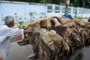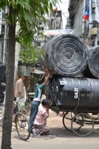 busy, unusual, odiferous, exotic, and a dozen other adjectives could be used to describe the activities around us. Push carts, donkey carts, and bicycle carts carried everything from animal skins and live animals to pots and pans to huge barrels to assorted goods for markets, and of course, people. We followed a bicycle cart carrying a mother and a young son for a while. They both kept an eye on us, and only after a few blocks did they both look out and smile at us.