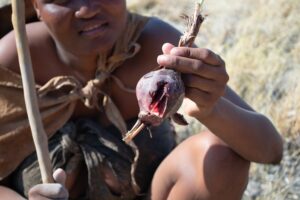 We followed this group out into the bush for close to two hours while they looked for and gathered food and medicinal plants, found water, and made a fire without matches. What looked like a nondescript single blade of grass, when dug up, was a brilliant red tuber for eating. Another produced a tuber that, when shaved and the pulp squeezed, yielded enough liquid for half a day of wandering in the desert.