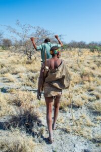 We spent a morning walking in the bush with the San—five of them, actually. Their names were impossible for us to decipher with all their clicks, but there was a young couple with three children, a grandfather, an elderly aunt, and a young man who acted as our interpreter of both their language and their way of life. Our interpreter spoke perfect English and dressed in Western clothing.